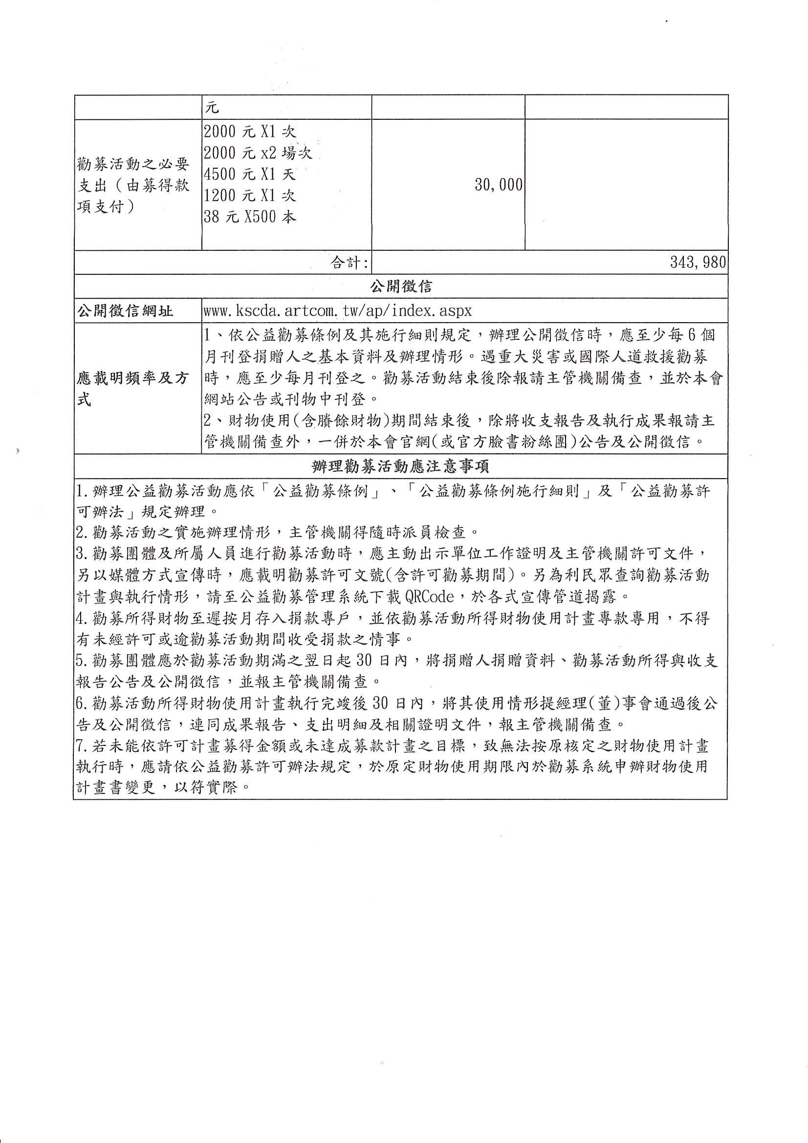 勸募許可字號高市社人團字第11339961200號勸募活動,原預計募款200,000元整,截止勸募活動結束募款總金額為343,980元,因此申請財物使用異動,並依公益勸募許可辦法第六條規定特此公告。